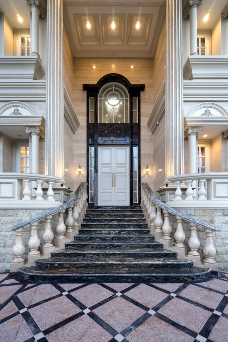 • Marmer statuario tipe athena berwarna hitam-emas salah satunya diterapkan pada tangga yang menuju pintu masuk utama. Kemewahannya serupa entrance gedung-gedung ikonik di Eropa.
