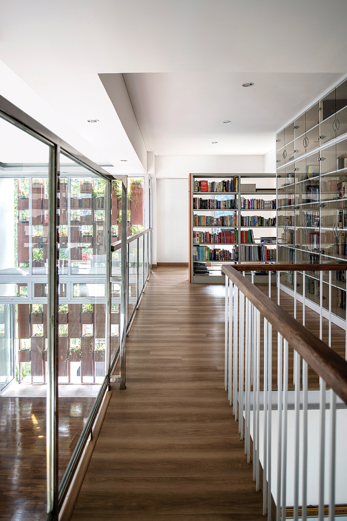 Namun, karena dibuat berlubang-lubang, sinar matahari masih bisa menembus ke dalam. Bahkan menciptakan bayangan yang indah ketika memantul ke lantai vinil bermotif kayu di belakangnya. Tidak hanya itu, vertical garden tersebut juga benar-benar berfungsi sesuai namanya. Klien menempatkan beberapa tanaman di antara space fasad bermaterial GRC board itu.