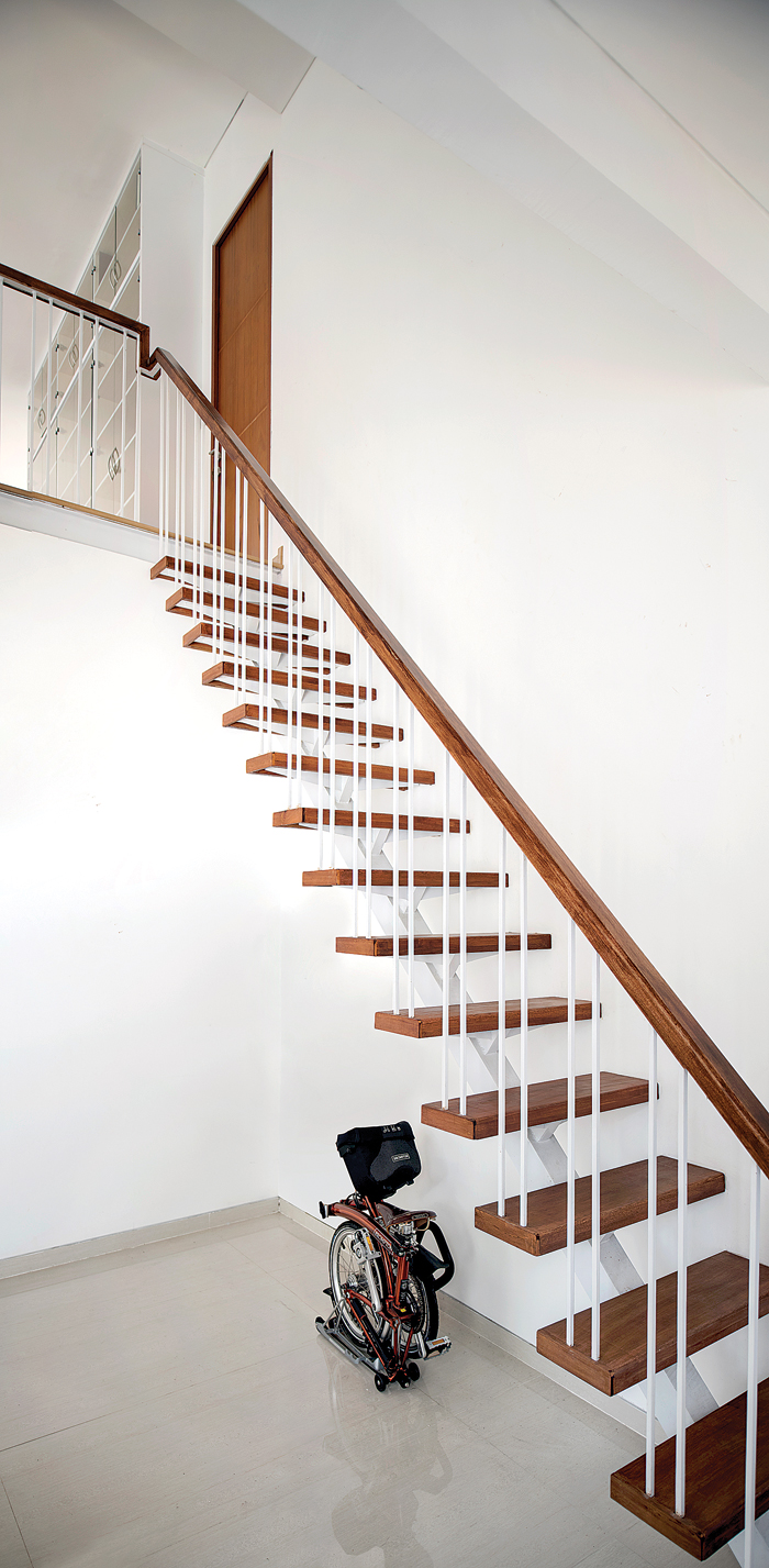 Tangga yang ada di lantai mezanin cukup unik karena seolah melayang. Tangga itu dibuat dengan material baja yang di-finishing dengan kayu sehingga menghasilkan look yang ”ringan” dan estetis.
