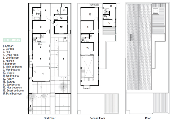 Dimulai dari depan, terdapat ruang keluarga yang kemudian langsung terhubung dengan area makan, dapur, dan kamar tidur utama, lengkap dengan kamar mandi, walk-in closet, serta ruang kerjanya. Sementara itu, sisi kanan difungsikan sebagai side courtyard sekaligus area kolam renang.