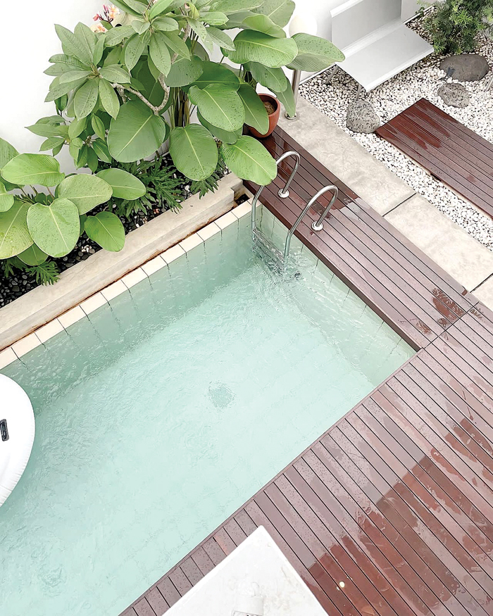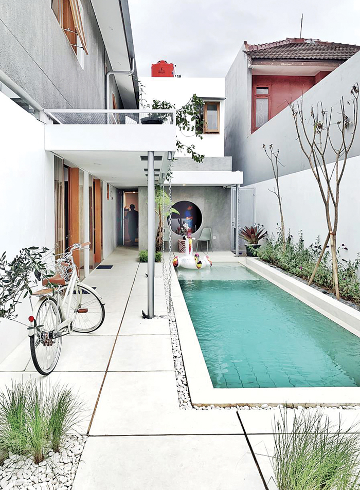 Lukie menempatkan lanskap tropis pada sisi kolam renang yang kontras dengan dinding dominan putih rumah itu. Tanamannya, antara lain, pakis monyet, calathea lutea, dan pakis brasil.