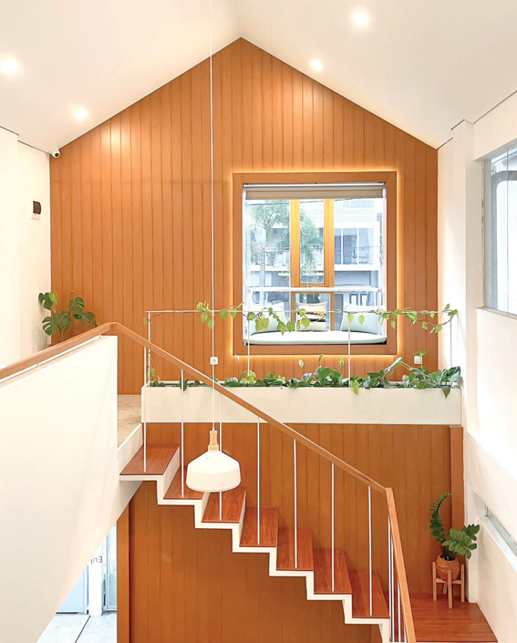 Mengimbangi eksterior yang serbaputih, warna interior dibuat menonjol, tapi masih bernuansa alam. Maka, material kayu pun dipilih untuk diterapkan pada dinding, tangga, hingga furnitur seperti meja dan cermin.