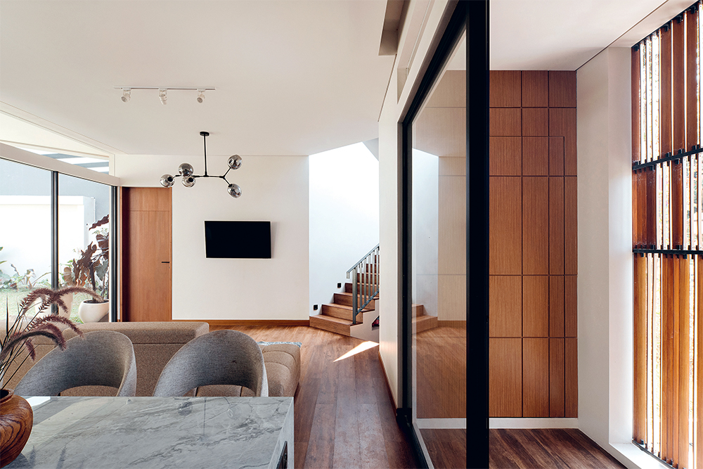 Pada bagian depan, dipasang secondary skin berupa kisi-kisi kayu. Di baliknya terdapat ruang keluarga dan ruang makan yang dibuat open space. ”Bukaan pada samping kiri-kanan ruang keluarga menggunakan kaca. Dengan begitu, sirkulasi dan pencahayaan alaminya makin optimal,” imbuh Ramos.