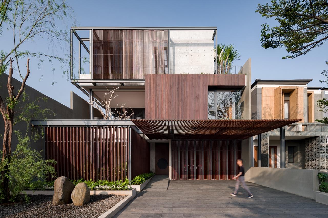 Pada fasad pertama yang tampak dari depan, screen kayu yang menjadi secondary skin di seluruh lantai mencuri perhatian. Terbuat dari kayu ulin, screen itu dibuat untuk menyaring sinar matahari yang masuk ke rumah melalui jendela.