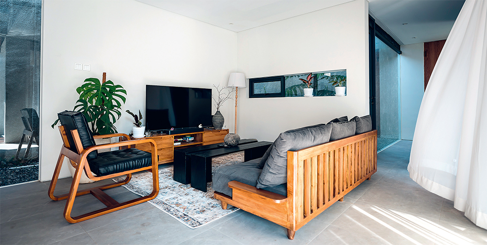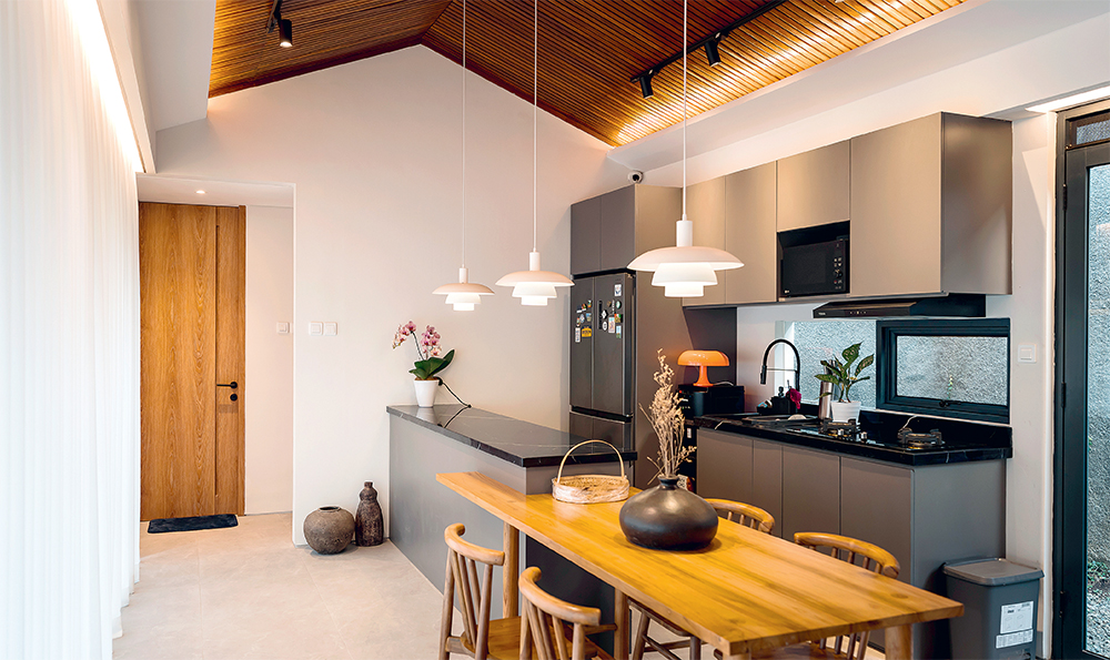 ”Dari luar kita meng-highlight bagian dalamnya. Tapi, ketika sudah di dalam, kita meng-highlight area luarnya,” beber Aditya. Warna hitam banyak diterapkan melalui pemilihan furnitur dan frame pintu serta jendela. Sedangkan elemen kayu tertuang pada lantai, pintu, kisi-kisi skylight, dan panel dinding. Dengan dominasi dinding putih, warna-warna itu menghasilkan nuansa yang hangat dan homey.