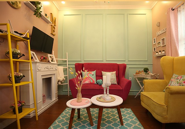 SOFA RUANG TAMU: Karena dinding sudah berwarna pastel, sofa dipilih dengan warna mencolok dan agak ”melawan” warna dinding. Magenta disesuaikan dengan warna pink pastel. Kuning disamakan dengan warna pernak pernik dan perabotan lain seperti kap lampu dan