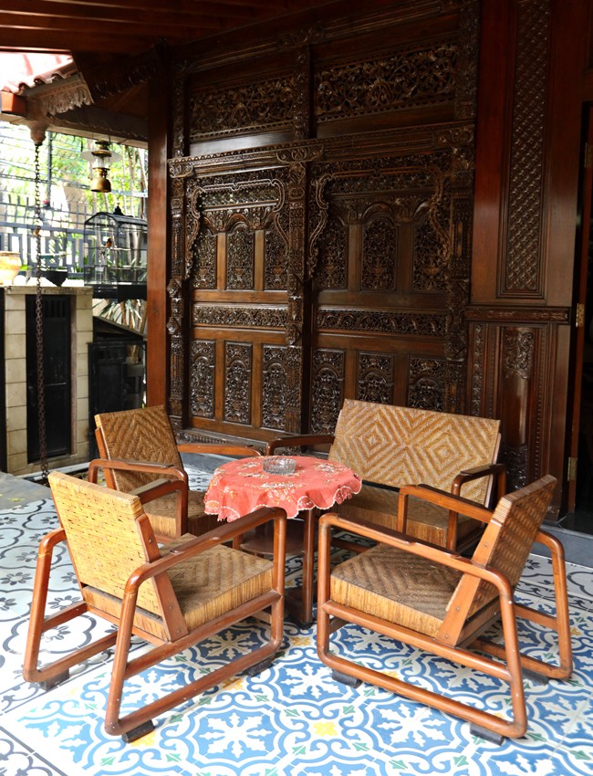 Gayuh lantas merancang teras yang lebih berwarna dan berkesan hangat. Dipasanglah tegel motif dengan perpaduan warna biru dan kuning cerah yang menghidupkan suasana. Tegel khas Jawa Tengah itu memang menjadi paduan paling pas dengan ukiran Jepara yang cantik.