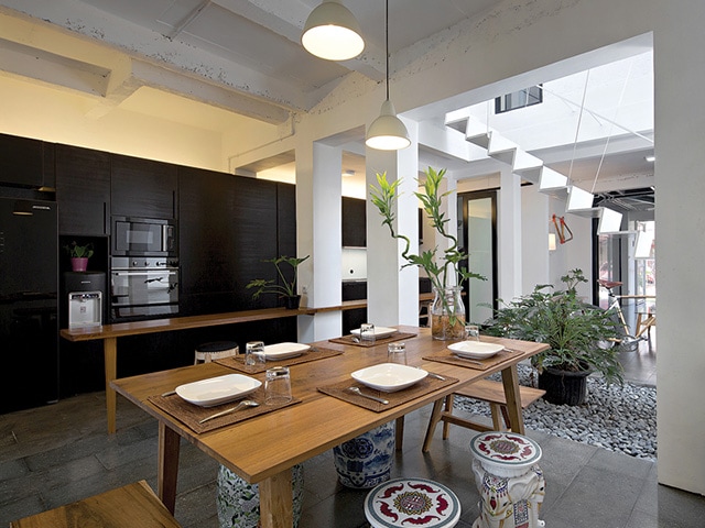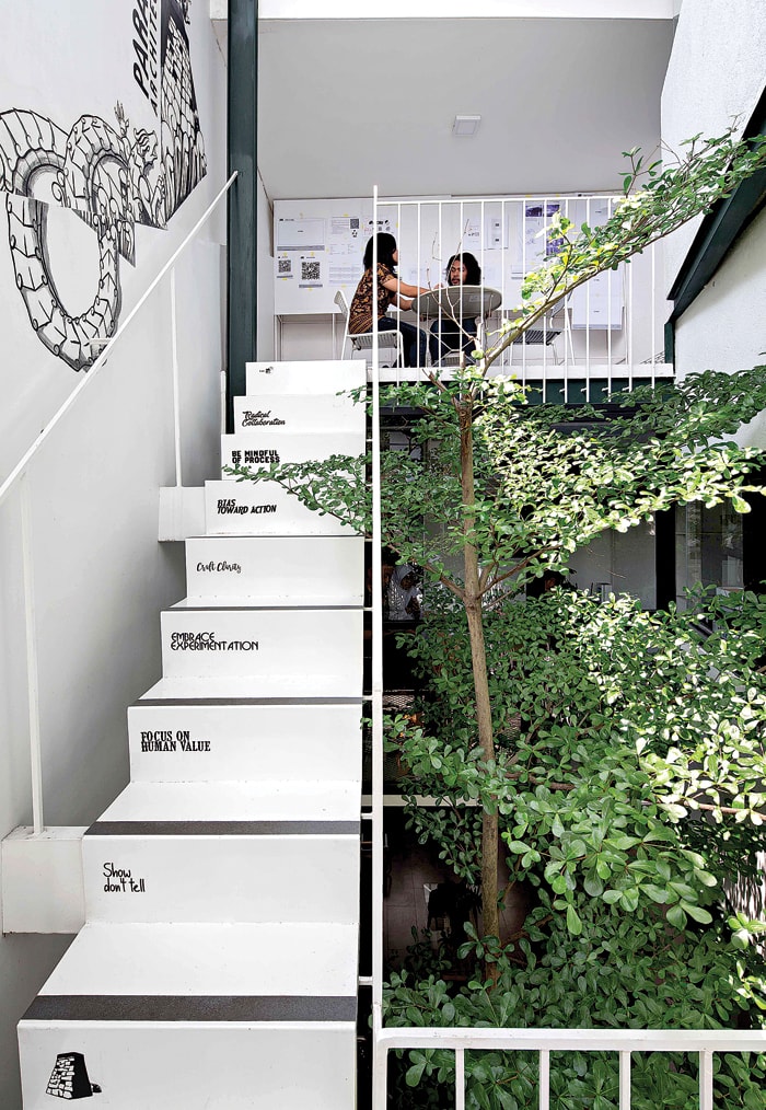 Area kosong sebagai sirkulasi udara dan cahaya dilengkapi beragam tanaman dan pohon. Mulai monstera, ketapang kencana, hingga lee kwan yew yang serasi dengan dinding putih.