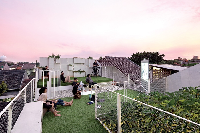 Di antara kompartemen hidup dan kerja, terdapat kompartemen sosial dengan komposisi miniamfiteater, public kitchen, living room, dan green rooftop.