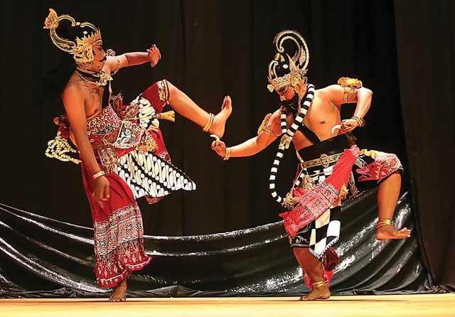 SENGIT: Salah satu adegan ketika Roso Tali (kiri) melawan Werkudara dalam pementasan di gedung Balai Pemuda kemarin (13/10). (Hariyanto Teng/Jawa Pos)