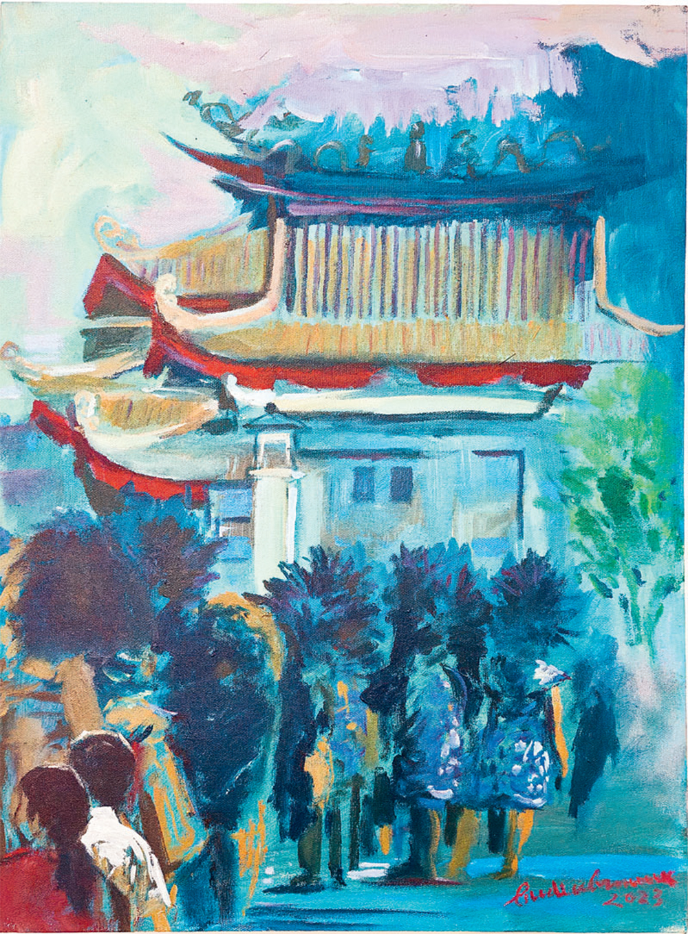 Saat dihubungi Kamis (11/1), Budi mengatakan, pusat peribadatan yang jadi objek lukisannya itu adalah Kelenteng Liong Hok Bio di kawasan Alun-Alun Magelang. ’’Saya tertarik melukis aneka ragam budaya adat di masyarakat. Kebetulan waktu itu ikut karnaval di Kota Magelang,” tulis Budi lewat WhatsApp.