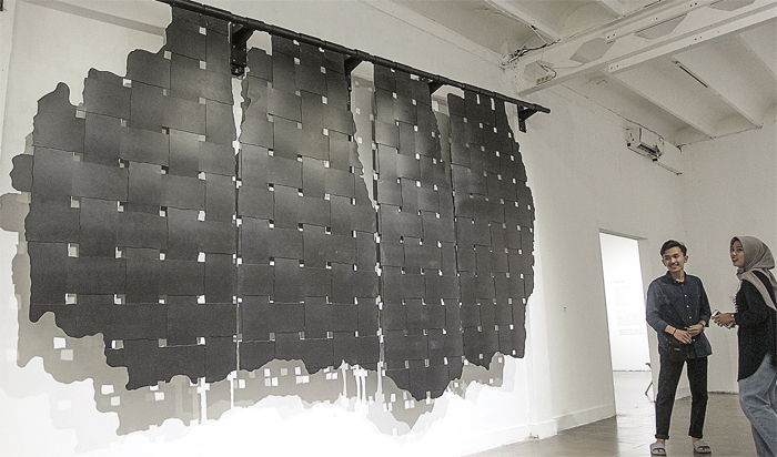 KEPERAKAN: Pengunjung melihat karya Hanafi berjudul Di Balik Tragedi. Karya ini terinspirasi dari protes warga Wadas, Purworejo.