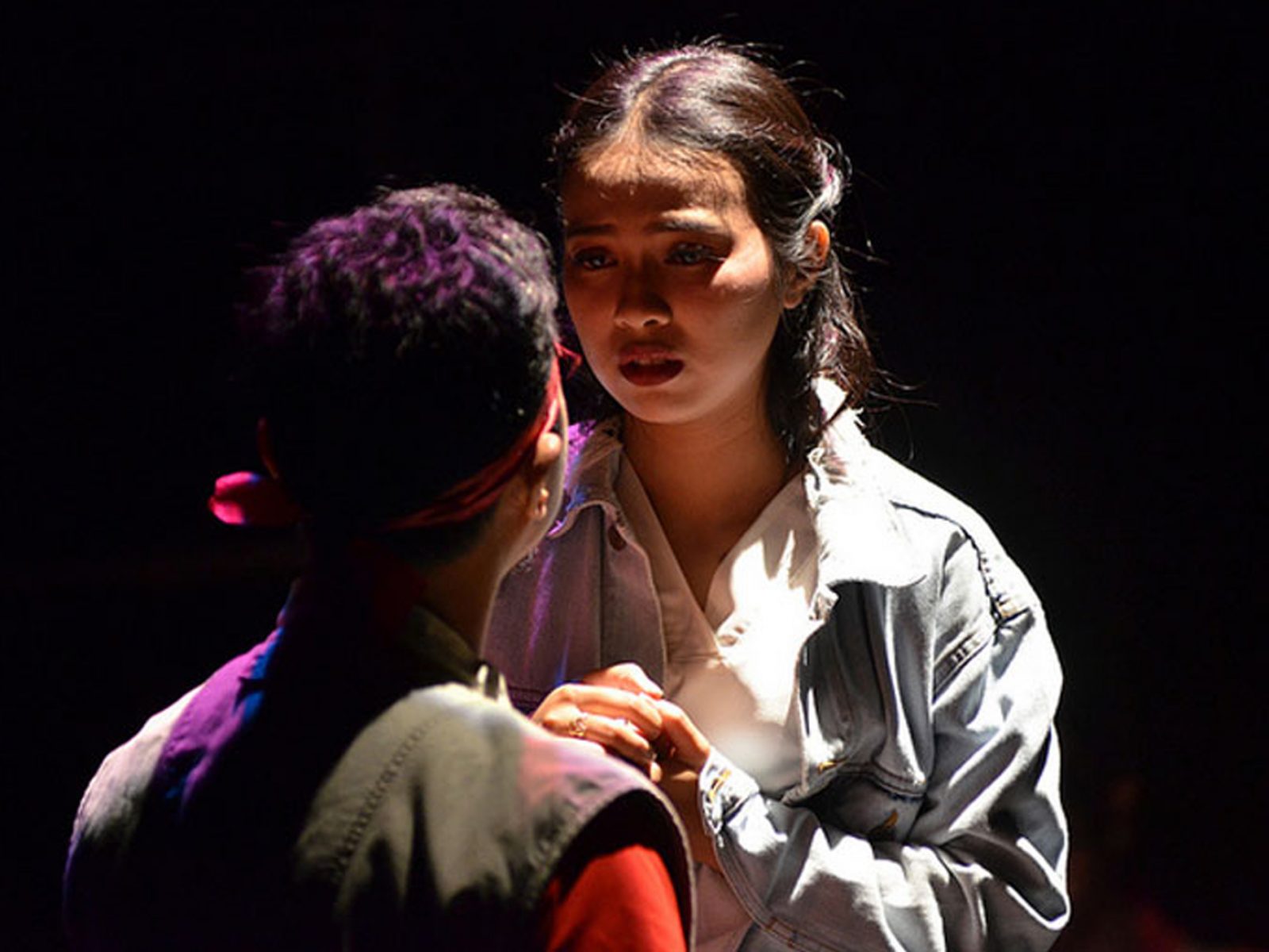Forum Aktor Yogyakarta (FAY) saat mementaskan Di Punggungmu Kusandarkan Waktu yang Tak Pernah Bicara Kita, adaptasi Pagi Bening dari Sunny Morning terjemahan Sapardi Djoko Damono. (Wicak Widhi Cahya for Jawa Pos) - Image