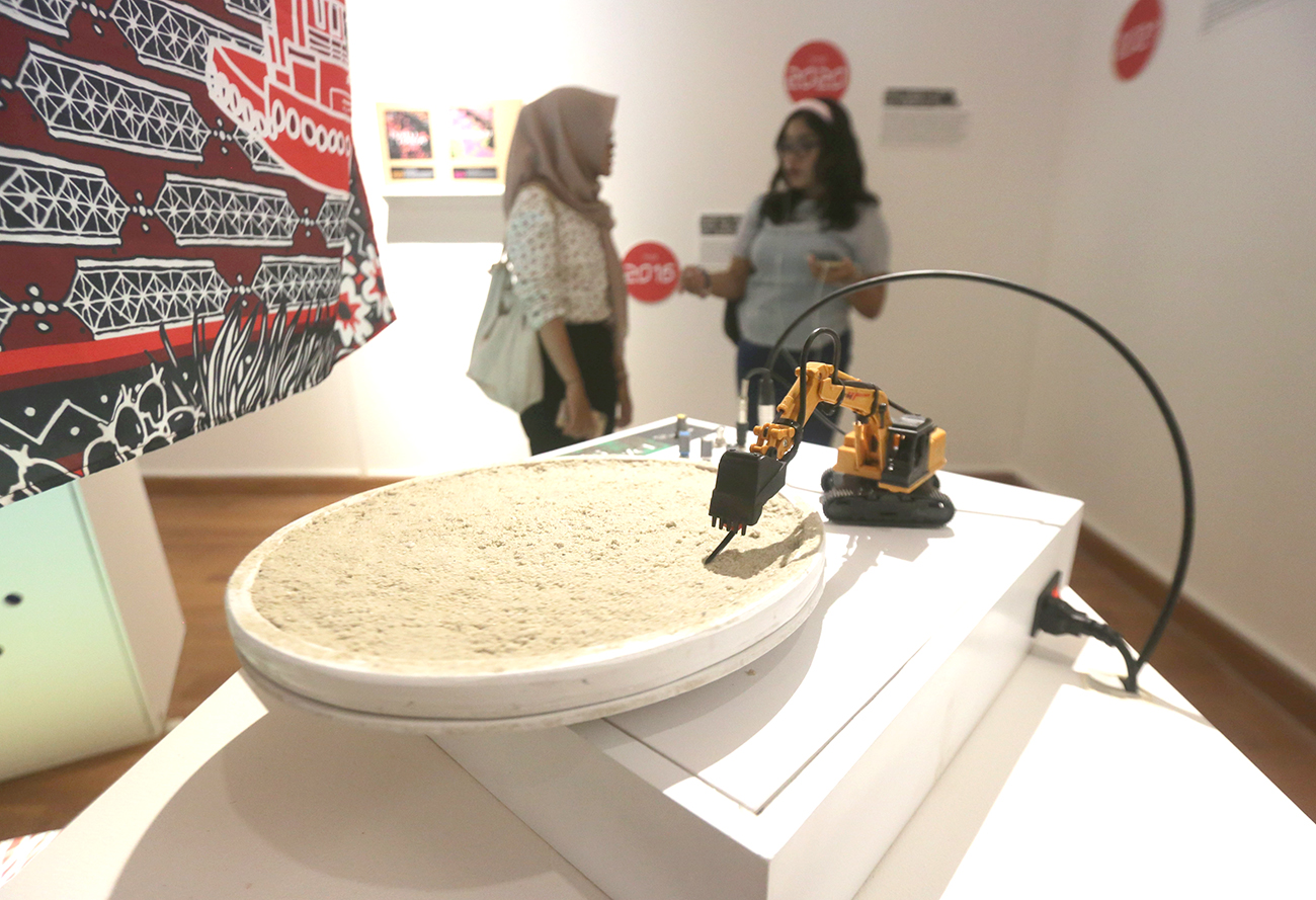 PESAN SATIRE: Pengujung karya Azizi Al Majid berjudul The Internet Love Machine Series di Galeri Nasional Indonensia pada pameran Seni Rupa Indonesia Kini: Pascamasa.