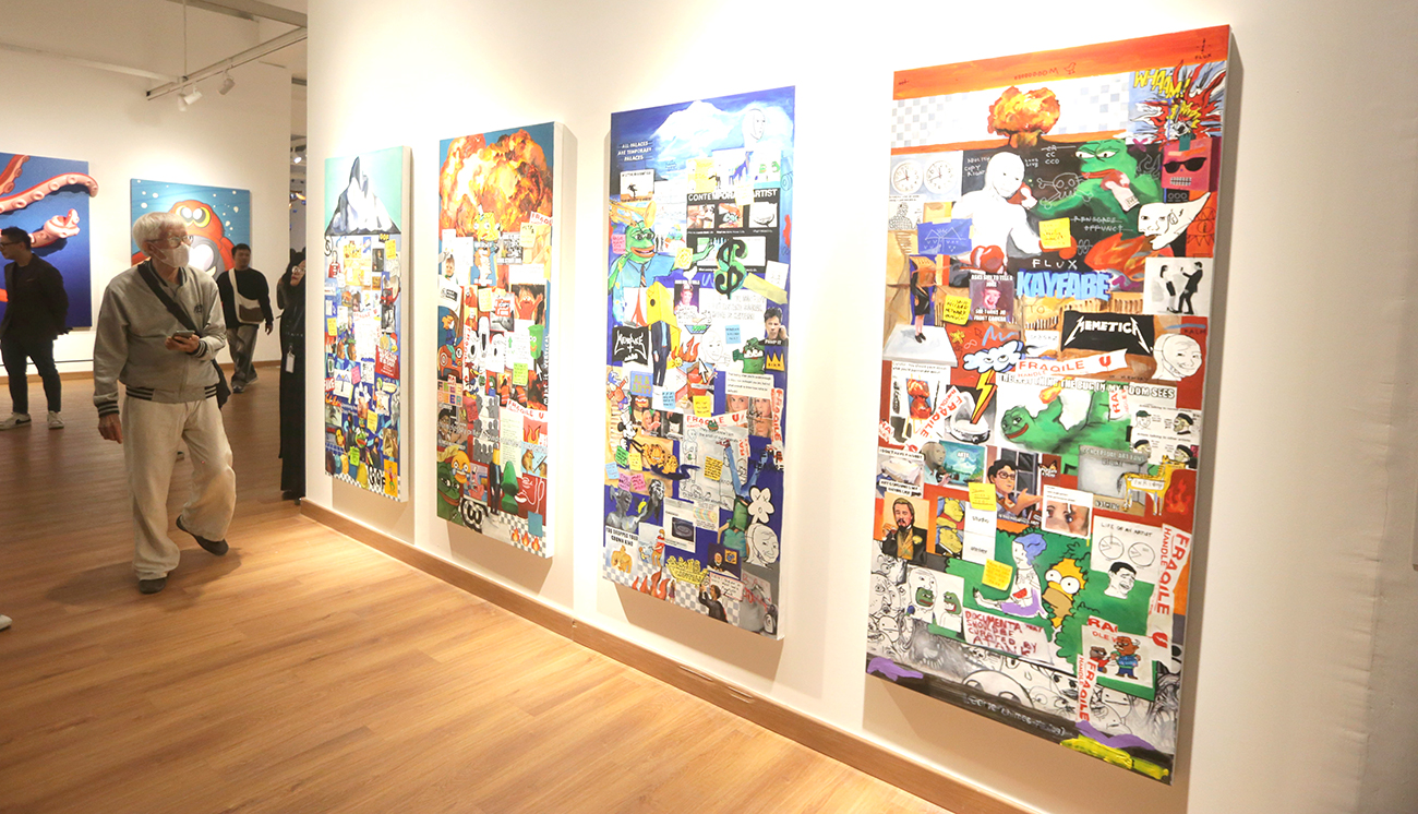 Beda lagi dengan seniman Azizi Al Majid. Dia memamerkan lima karya, empat di antaranya merupakan kesinambungan atas fenomena meme di internet. Empat lukisan itu sengaja ditorehkan dalam kanvas vertikal yang merepresentasikan telepon pintar.