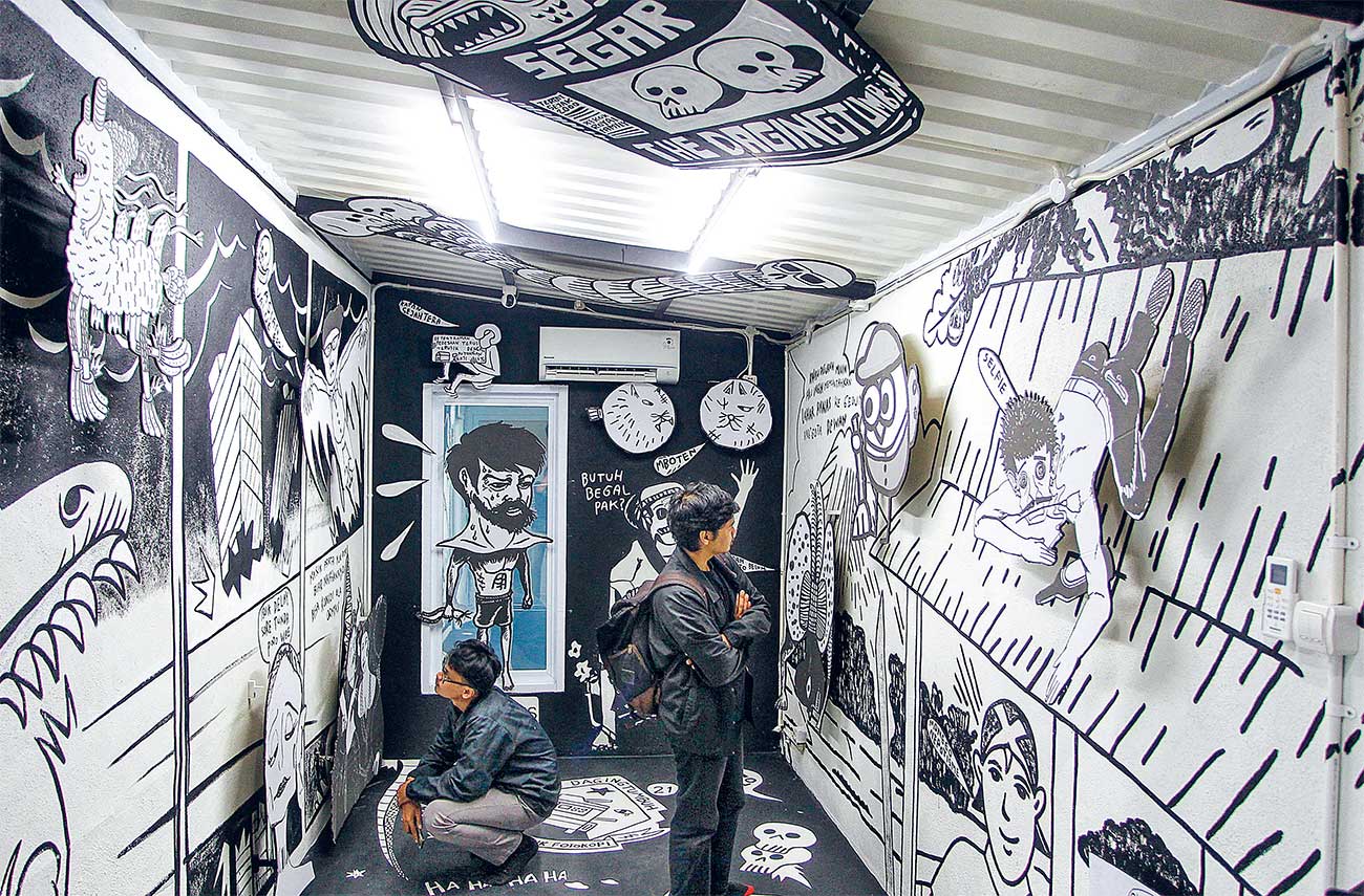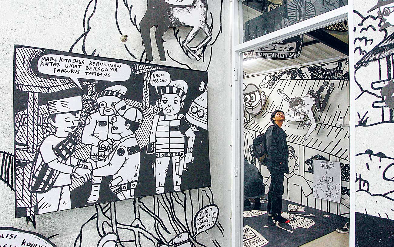 MERUANG: Pameran The Dagingtumbuh Vol 21 Partai Komik Fotokopi memanfaatkan dinding, lantai, dan langit ruangan DGTMB Shop sebagai ruang pajang karya.