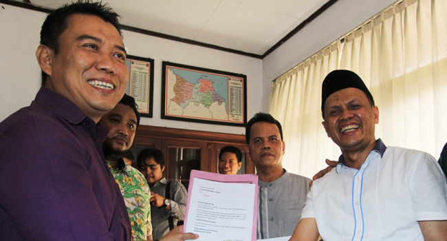 MUNDUR: Bakal calon wakil bupati yang diusung koalisi PDI Perjuangan, PKB dan Nasdem, Rastawiguna, menyerahkan surat pengunduran diri ke KPU Indramayu, Sabtu (22/8).