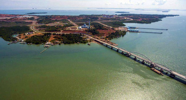 Jembatan Dompak yang menghubungkan Kota Tanjungpinang dengan Pulau Dompak terlihat dari ketinggian.