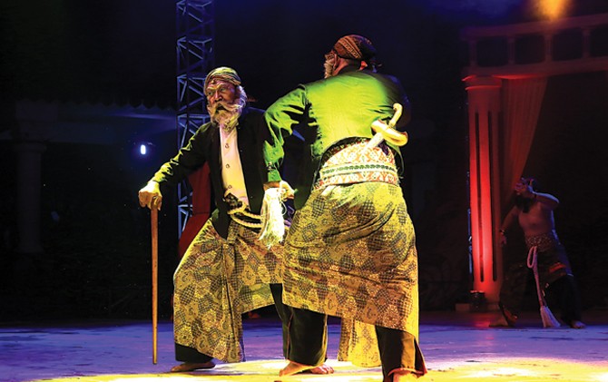 TOKOH SENI: Dua warok beratraksi sambil memegang kolor dan tongkatnya. Warok punya fungsi sentral dalam kesenian Reog Ponorogo sebagai sosok pemimpin.