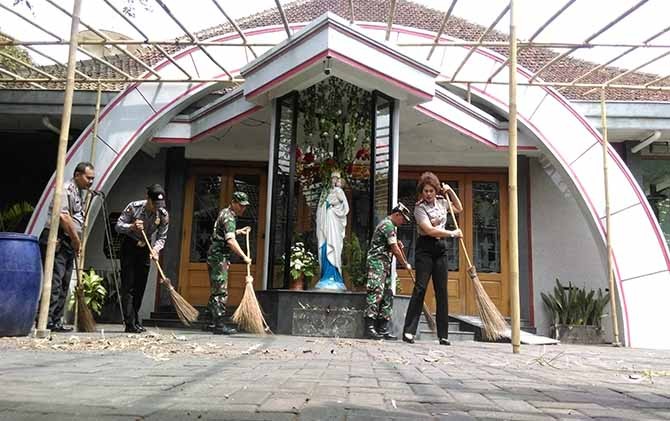 JawaPos.com - Personel TNI dan Polri membantu membersihkan Gereja Perawan Maria Regina Purbowardayan, Jalan Ahmad Yani, Solo, Selasa (26/12) pagi. Mereka bergotong royong menyapu halaman gereja.