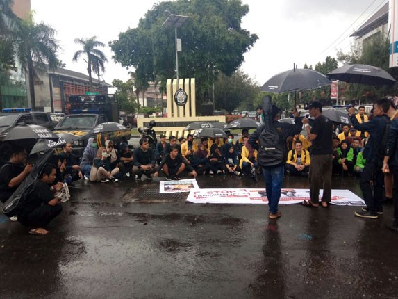 Aksi mereka pun kemudian dilanjutkan dengan orasi oleh sejumlah mahasiswa, yang beberapa dari mereka memegangi spanduk bertuliskan ‘Stop Kriminalisasi Pedjoeang Lingkungan: Bebaskan Kawan Kami, Kawan Kami Hanya Ingin Memperjuangkan Lingkungan Dan Udara Bersih’.