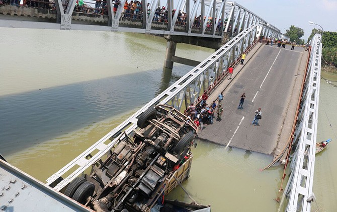 Saat ambruk, arus lalu lintas di atas jembatan tersebut cukup padat. Beberapa kendaraan yang tercebur ke dalam sungai Bengawan Solo antara lain 1 dump truk muat limbah smelter, 2 truk tronton muatan pasir, dan 1 sepeda motor. Saat ini, petugas sudah berada di tempat kejadian perkara (TKP).
