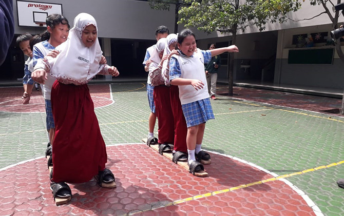Siswa SD Muhammadiyah 6 dan SD Santa Clara bermain bakiak di lapangan SD Santa Clara, Kamis (24/5). - Image