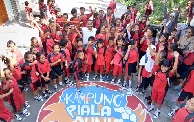 Senin (28/5) pagi, ratusan siswa dari SD Kandangsapi 140 mendatangi Kampung Piala Dunia. Siswa kelas 4-6 itu kompak mengenakan seragam olahraga. Mereka terlihat riang saat menyaksikan setiap keunikan yang diinisasi Mayor Haristanto tersebut.