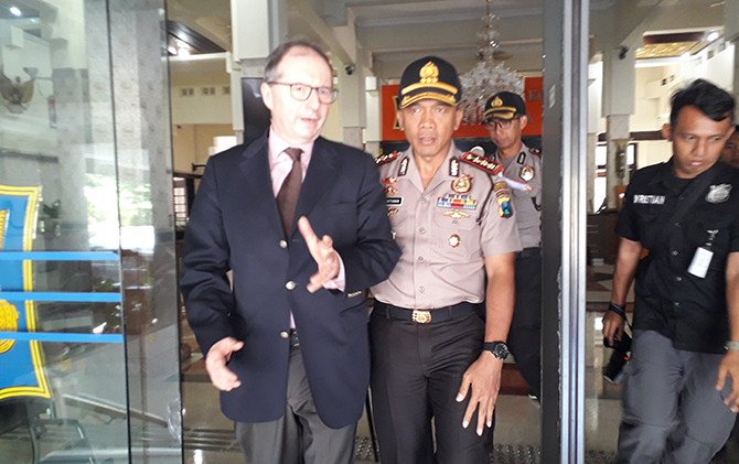 Duta Besar Prancis untuk Indonesia Jean Charles Berthonnet (kiri) usai mengadakan pertemuan dengan Kapolrestabes Surabaya Kombes Pol Rudi Setiawan di Balai Kota Surabaya, Senin (28/5).