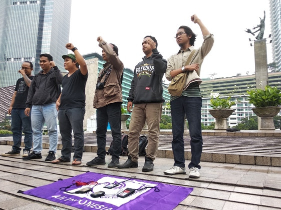 JawaPos.com - Massa dari beberapa insan pers melakukan aksi solidaritas di Bundaran Hotel Indonesia, Jakarta Pusat, Sabtu (2/6) pagi. Aksi itu digelar terkait serangan kader PDIP di kantor Radar Bogor pada Rabu (30/5) dan Jumat (1/5).