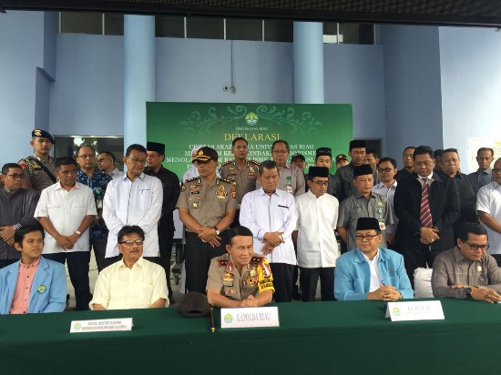 JawaPos.com - Pasca ditangkapnya tiga alumni yang diduga sebagai teroris oleh Densus 88 dan Polda Riau di kawasan kampus, civitas akademika Universitas Riau (UNRI) menggelar deklarasi yang menyatakan bahwa, mereka bukan teroris. di depan gedung rektorat pada Senin (4/6) pagi.