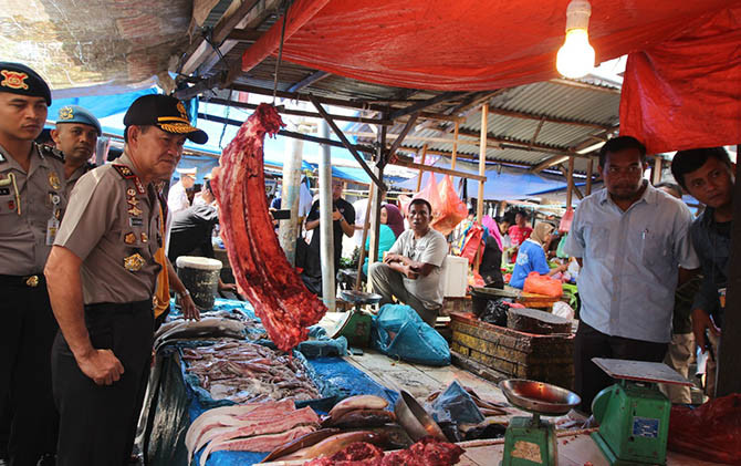 JawaPos.com - Polda Riau bersama dengan Forkopimda melakukan inspeksi mendadak (sidak). Sasarannya Pasar Bawah, Jalan Jenderal Sudirman Ujung, Pekanbaru. Sidak dilakukan untuk mengecek stabilitas harga sembako jelang Idul Fitri 1439 Hijriah.
