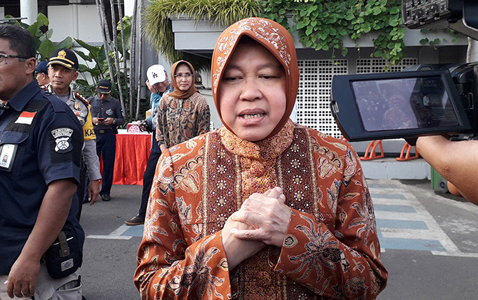 Wali Kota Tri Rismaharini usai menggelar apel siaga pengamanan kota di Taman Surya.