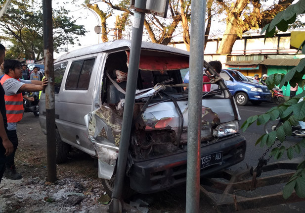 RINGSEK: Mobil Daihatsu Zebra bernomor polisi N 1355 AD ringsek usai terlibat kecelakaan di Kota Malang, Senin (18/6) sore.
