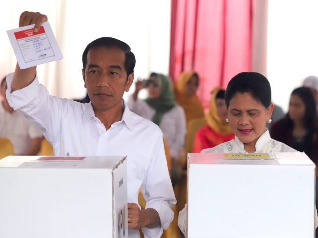 Capres nomor urut 01 Jokowi Dodo bersama Istri Iriana Jokowi mengunakan hak suaranya di TPS 008, Gambari, Jakarta, Rabu (17/4). Foto: Dery Ridwansah