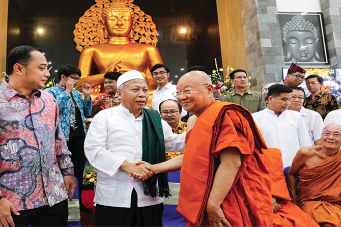JAGA KERUKUNAN: Banthe Viriyanadi Mahathera (kanan) menemui perwakilan tokoh lintas agama dan Eri Cahyadi usai memimpin puja bakti perayaan Waisak di Wihara Buddhayana Dharmawira Centre (BDC), minggu (19/5). (Alfian Rizal/Jawa Pos)