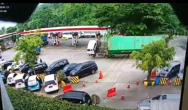 Dari video yang beredar detik-detik truk tersebut terguling. Dalam video itu memang terlihat truk melaju cukup cepat saat memasuki SPBU. Truk itu tampak menghindari mobil minibus berwarna hitam di depannya. Menurut informasi, kontainer itu masuk ke rest area lantaran hendak mengisi bahan bakar.