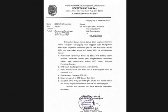 Kepala BPKAD (Badan Pengelola Keuangan Dan Aset Daerah) Kabupaten Tulungagung Johanes Bagus Kuncoro seperti dilansir dari Antara di Tulungagung menjelaskan, keterlambatan gaji periode itu karena ada migrasi data dari sistem informasi badan kepegawaian daerah (SIBKD) ke sistem informasi perangkat daerah (SIPD) yang dikelola langsung oleh pusat.