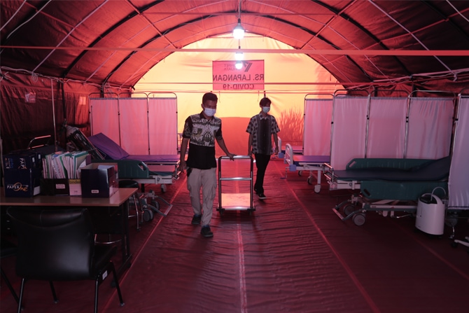 Tenaga kesehatan saat mengecek alat medis di Rumah Sakit Lapangan RSUD Cipayung, Jakarta, Jumat (3/9/2021). Pembangunan RS Lapangan tersebut guna mempercepat penanganan dan kemudahan layanan perawatan bagi masyarakat yang terpapar Covid-19. Foto: Dery Rid