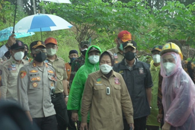 Menteri Sosial Tri Rismaharini (tengah) mengikuti proses evakuasi warga di area terdampak bencana tsunami di Pelabuhan Tamperan, Pacitan, Sabtu (11/9). Humas Kemensos/Antara