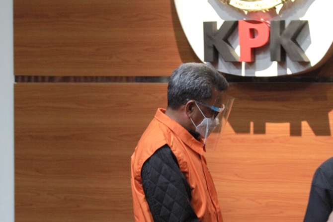Gubernur Sulawesi Selatan Nurdin Abdullah mengenakan rompi tahanan usai menjalani pemeriksaan di gedung KPK, Jakarta, Minggu (28/2/2021) dini hari. KPK menetapkan tiga orang tersangka dalam Operasi Tangkap Tangan (OTT) terkait kasus dugaan suap proyek inf