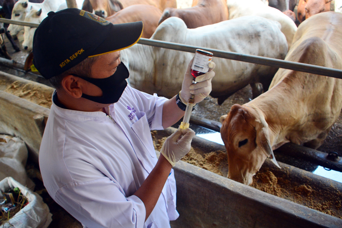 Petugas saat menyuntikan vitamin pada seekor sapi kandang sapi di kawasan, Rangkapan Jaya, Depok, Jawa Barat, Jumat (20/05/20222). Penyemprotan dilakukan UPTD Rumah Potong Hewan Depok sebagai upaya pencegahan menyebarnya penyakit mulut dan kuku (PMK) pa