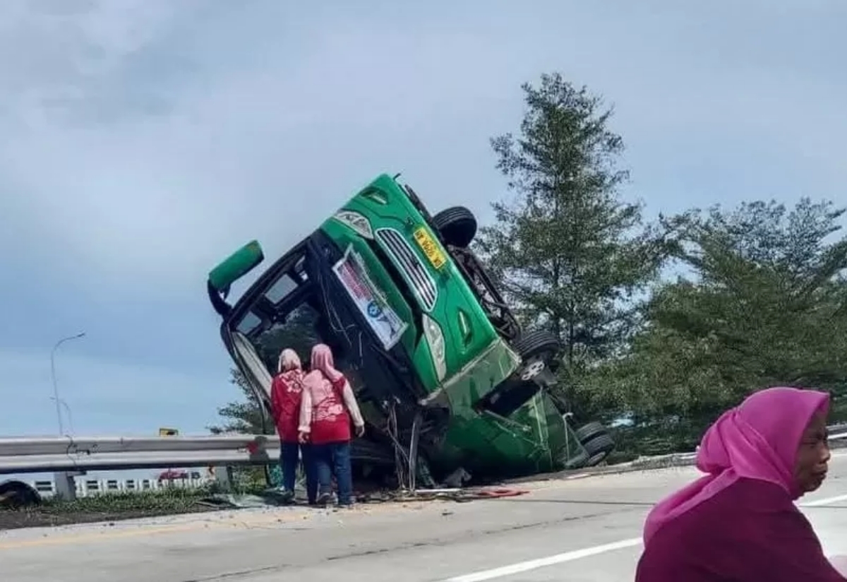 Bus dengan nomor polisi L 7791 AF tersebut diduga mengalami rem blong hingga mobil hilang kendali dan terguling. (istimewa)