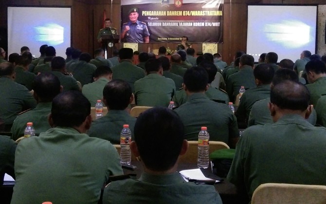 JawaPos.com - Komandan Resort Militer (Korem) 074/Warastratama Kolonel Inf Widi Prasetijono mengumpulkan anak buah. Khususnya komandan komando distrik militer (Kodim) dan komando rayon militer (Koramil) se-Solo Raya. Kegiatan berlangsung di Hotel Pose In, Solo, Senin (11/12).