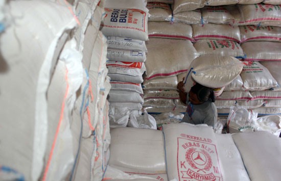 Ilustrasi: Seorang pekerja sedang menaruh beras di gudang.