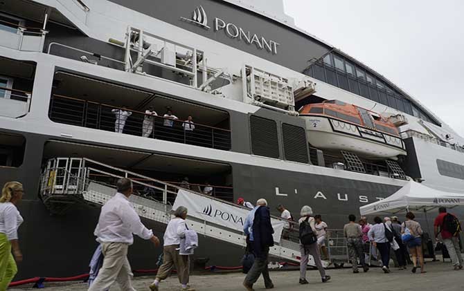 Kapal pesiar berbendera Prancis, MV L AUSTRAL sandar di Terminal Penumpang Bandar Deli, Pelabuhan Belawan, Selasa (14/11). - Image