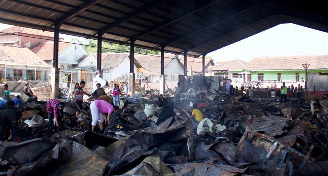 MENCARI SISA-SISA: Sejumlah pedagan Pasar Sumber Kabupaten Cirebon, Jawa Barat, berusaha mencari barang berharga yang masih tersisa setelah terbakar hangus.