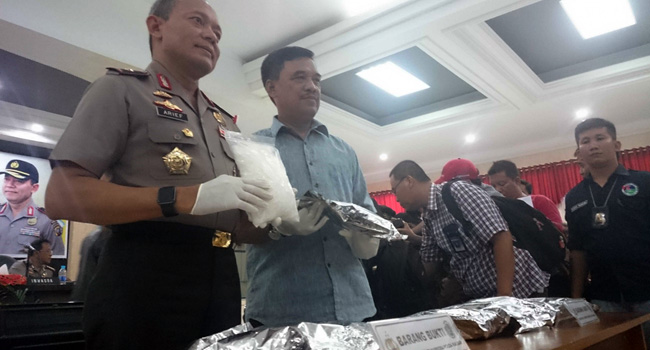 “Dwi dijerat dengan pasal 112, 114 dan atau 115 Undang-Undang RI nomor 35 tahun 2009 dengan ancaman penjara minimal 20 tahun, maksimal penjara seumur hidup,” tegas Handono.