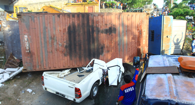 LAKA LANTAS: Kontainer yang kelebihan beban terbalik saat menanjak di jalan MT Haryono, Balikpapan. Akibatnya, pengemudi mobil Hilux tewas di lokasi kejadian karena terjepit. Sementara pengendara sepeda yang juga terjepit motor selamat.