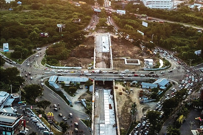 DITUNGGU-TUNGGU: Progres pengerjaan underpass bundaran Satelit dilihat dari udara kemarin sore (13/5). (Riana Setiawan/Jawa Pos)